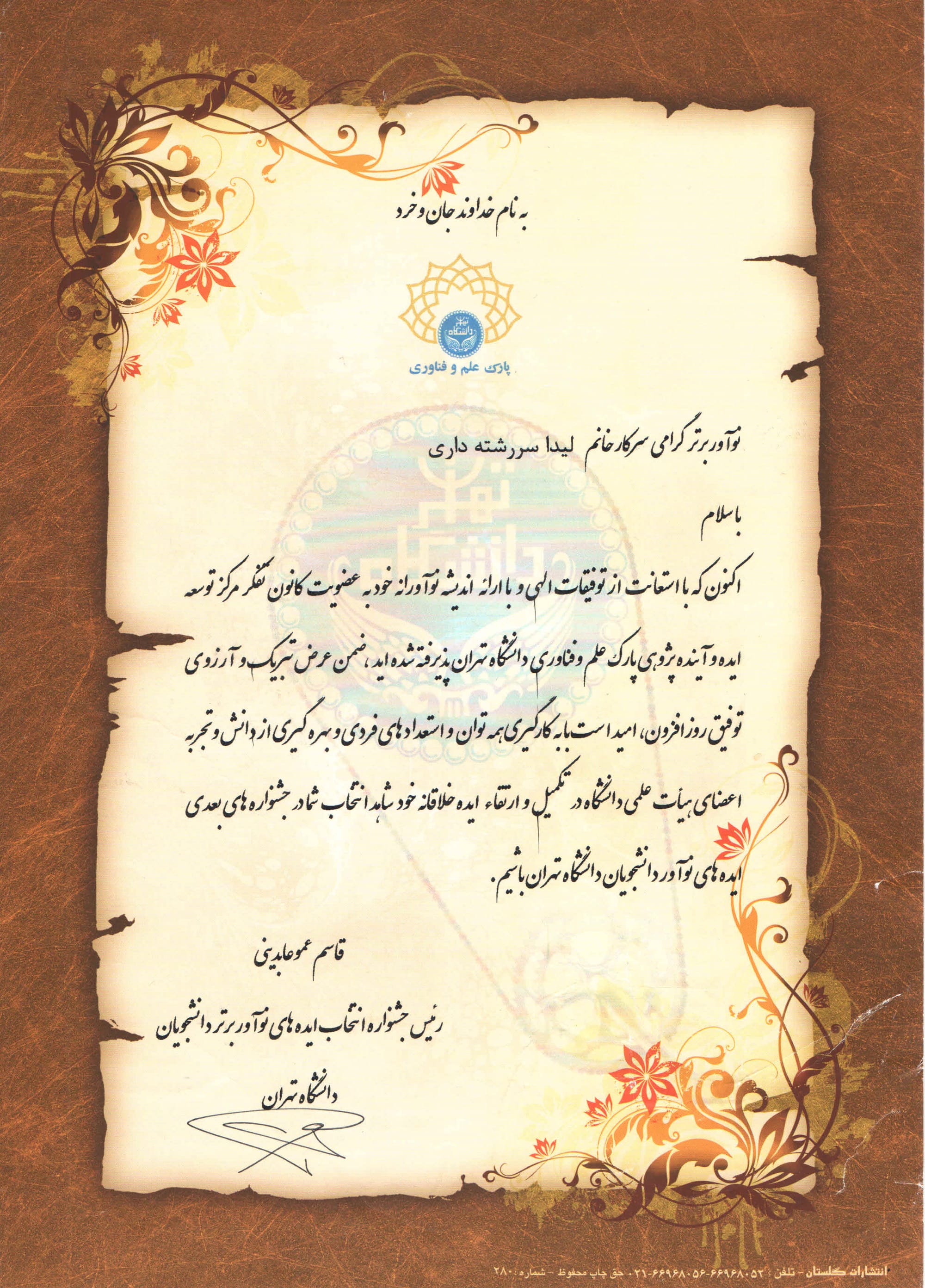 Selected as best business design idea (environment), Registration of industrial design (cardboard furniture) in science and technology park, university of Tehran, Iran (2012)* among the master degree students in more than 20 faculties of the University of Tehran.