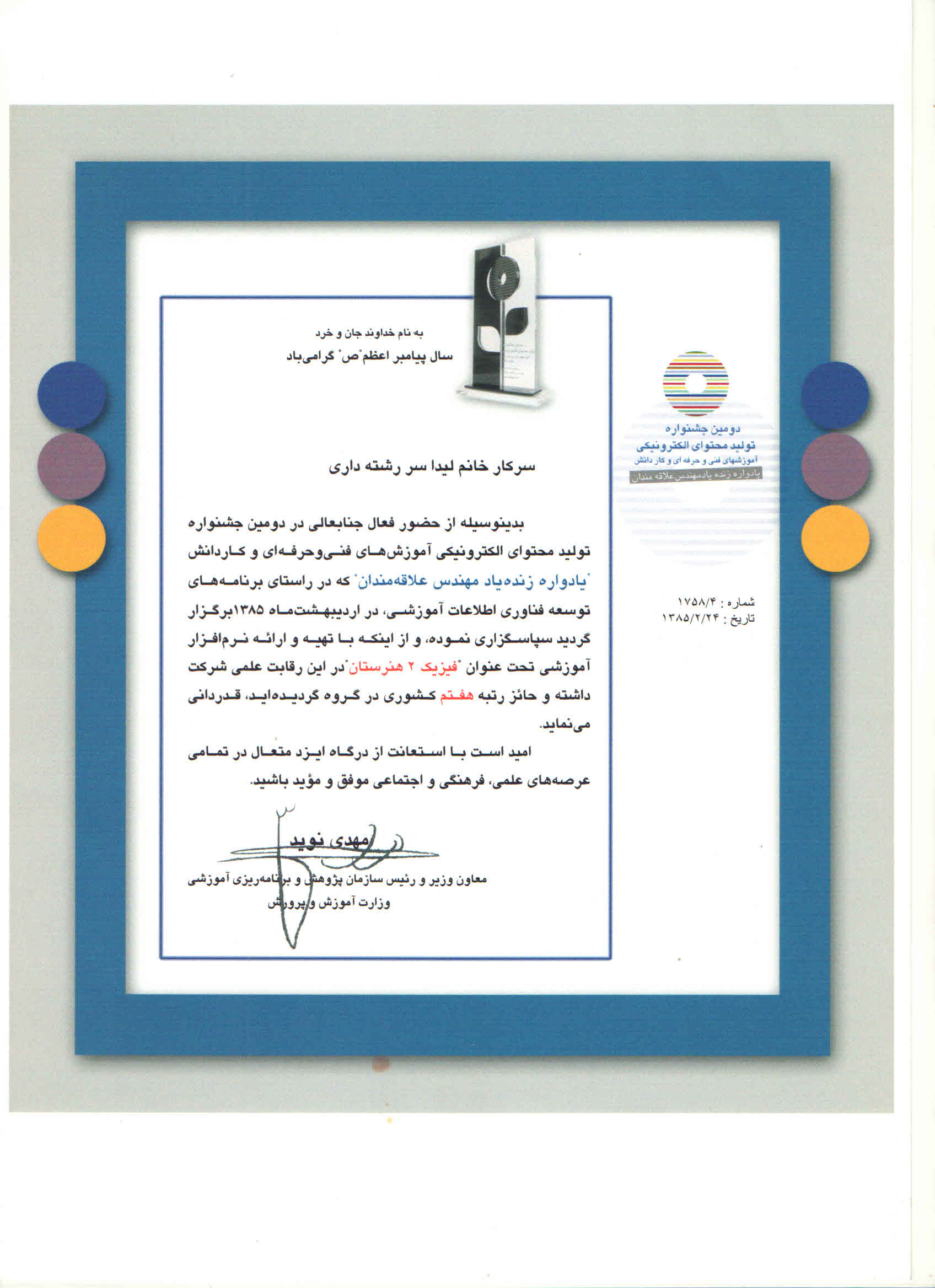 The seventh place in the competition on “Math education smart software design” in Iran, Development of information technology in education field, designated by the Ministry of Education, 2005.